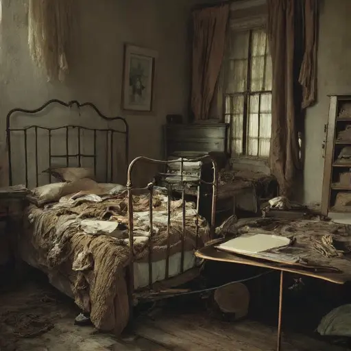 The house remains abandoned, its threads hanging taut, fabrics unfinished, looms silent, the quiet of the weaving room holding the meticulous, unresolved labor of a life halted by circumstance.