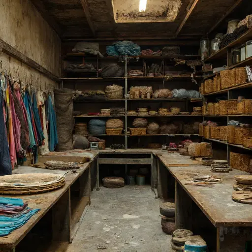 The loom rests ready, shuttles threaded, spools partially used. A ledger beneath the workbench lists orders, colors, and thread sequences, but stops mid-page. Pattern sketches are pinned to the wall, some curling from humidity. Stray threads trail across benches, showing where work was halted. Dust collects in corners, on chairs, and over half-completed fabrics. A pair of worn slippers remains tucked under the table, suggesting Hernández intended to return, yet never did.