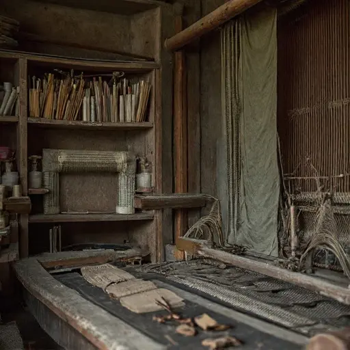 The Weaving Chamber hums with the memory of motion. Here, the loom dominated the day: threads drawn taut, shuttles flying, colors aligned. Every movement is frozen mid-cycle; the space holds an absent rhythm, precise and patient, as if waiting for hands that never returned.