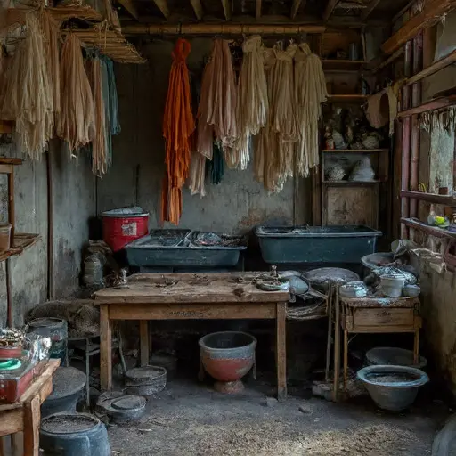 This chamber belonged to Ivan Petrov, master weaver (b. 1875, St. Petersburg), trained through a guild and apprenticed under local textile masters. His skill is evident in meticulous selvage edges, precise color gradations, and Russian-labeled pattern notes. A folded slip reminds his wife, Ekaterina Petrov, “sort the silk for the morning.” Ivan’s temperament was careful, measured, and persistent; ambition lay in producing exquisite tapestries for civic halls and private estates, yet always tempered by the slow rhythm of thread and shuttle.