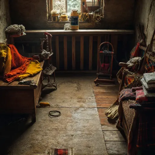 Subtle distress threads through the interiors. In the Upper Storage Cupboard, a half-dyed skein shows uneven saturation, stained by dye that cooled too soon—rare for Fiona’s discipline. A merchant’s invoice, creased sharply, lists higher prices for imported mordants. On the Guest Cot, a homespun shawl lies folded over a travel satchel, though no other belongings are prepared. A cracked dye pot, its rim chipped recently, suggests a moment of strain—perhaps financial worry, perhaps faltering eyesight that muddled her once-steady color judgment.