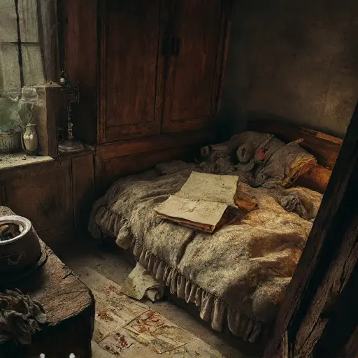Her notes—delicate, exact, and methodical—record letter forms, ink mixtures, and decorative flourishes. A folded slip referencing her apprentice, Fiona Sullivan, “finish gospel page Tuesday,” hints at a disciplined daily routine: preparing inks, drafting letters, and illuminating pages, all balanced with domestic oversight.