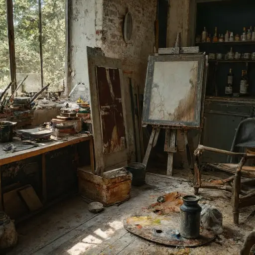 On the easel, a partially completed canvas shows a harbor scene abruptly halted mid-wave. Brushes lie abandoned on the table, dust settled over each bristle. Sketchbooks and preparatory drawings are scattered, evidence of repeated revisions abandoned mid-process. Every unfinished painting reflects suspended intention, halted with no explanation or continuation.