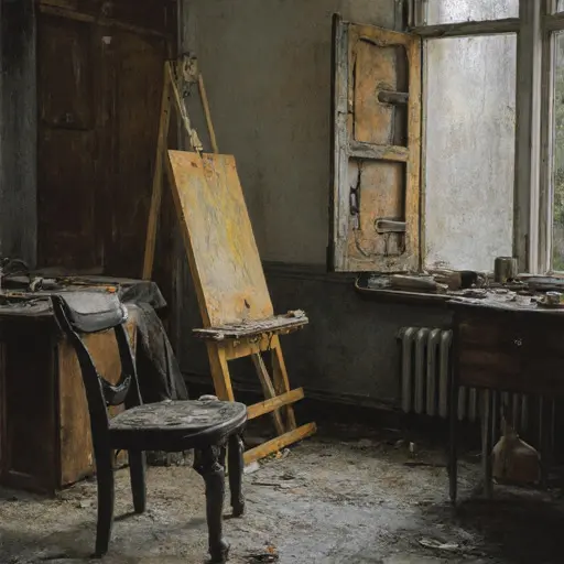 The house remains abandoned, palettes untouched, canvases idle, brushes unmoved. The atelier preserves the memory of a life shaped by color and craft, ended when vision failed, routines indefinitely suspended, leaving artistic work unresolved, forgotten, and haunting through absence.