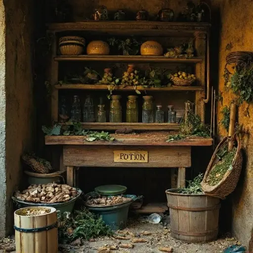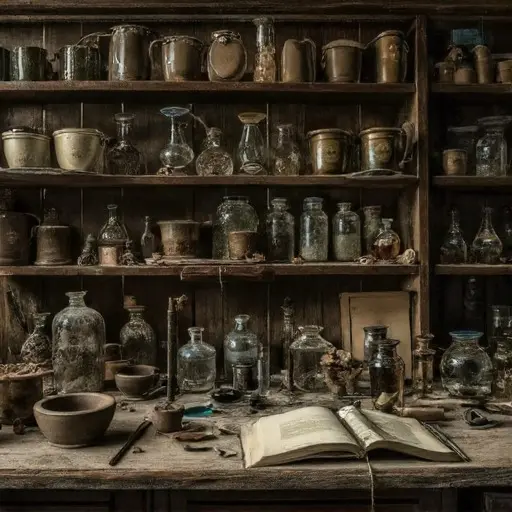 A heavy stillness hangs in the Cabinet, where jars of dried roots, powders, and tinctures sit unmoved. Each tool, vial, and note implies repeated routines abruptly halted, the air thick with suspended practice. The dust settles in precise lines where equipment had rested, capturing the faint motion of work abruptly stopped.