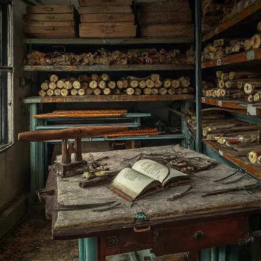 Later ledger pages show altered counts, crossed-out measurements, and repeated recalculations. One note reads simply: “client dispute,” underlined once. A failed commission for a legal archive left volumes unpaid and materials wasted. Julian’s correspondence thins after that point. Marie’s visits became irregular. Eventually, the press was never turned again. The signature piles remain folded, unstitched, and waiting.