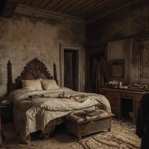 The house remains abandoned, tables, tools, and books frozen in quiet incompletion, every volume and grain awaiting hands that will never return.