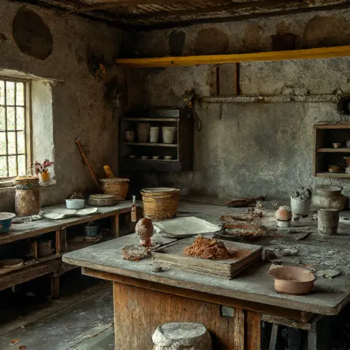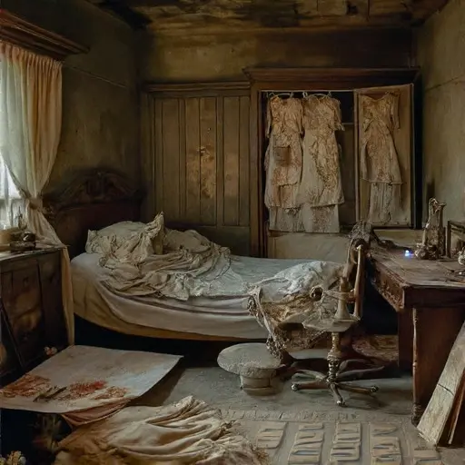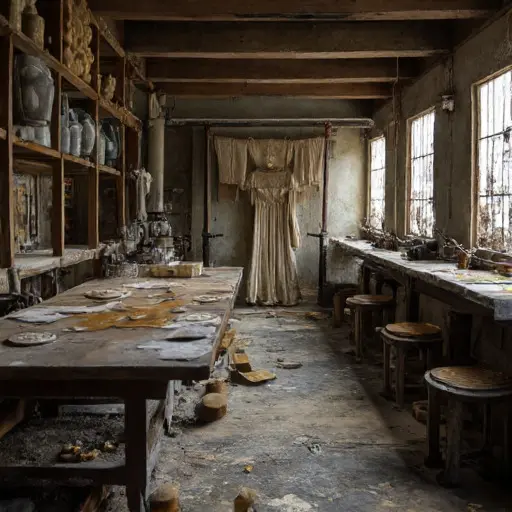 The house remains abandoned, silks and stencils suspended mid-creation, preserving the quiet persistence of craft and artistry, unfinished and unresolved, resting in silent neglect.
