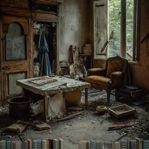 Tables hold partially inked stones and scattered rollers. Brushes, tarlatan, ink knives, and spatulas lie stiff with dried pigment. Stacked sheets of paper rest nearby, edges curling with dust. Luca’s ledger, weighed down by a press plate, details client names, designs, and ink formulas. Dust settling over implements emphasizes abrupt cessation of repeated, precise motions, the silence accentuated by half-printed sheets and misplaced stencils.