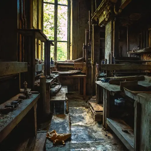 The house remains abandoned, presses, stones, and tools awaiting hands that will not return, the quiet heavy with unfinished craftsmanship and lost mastery.