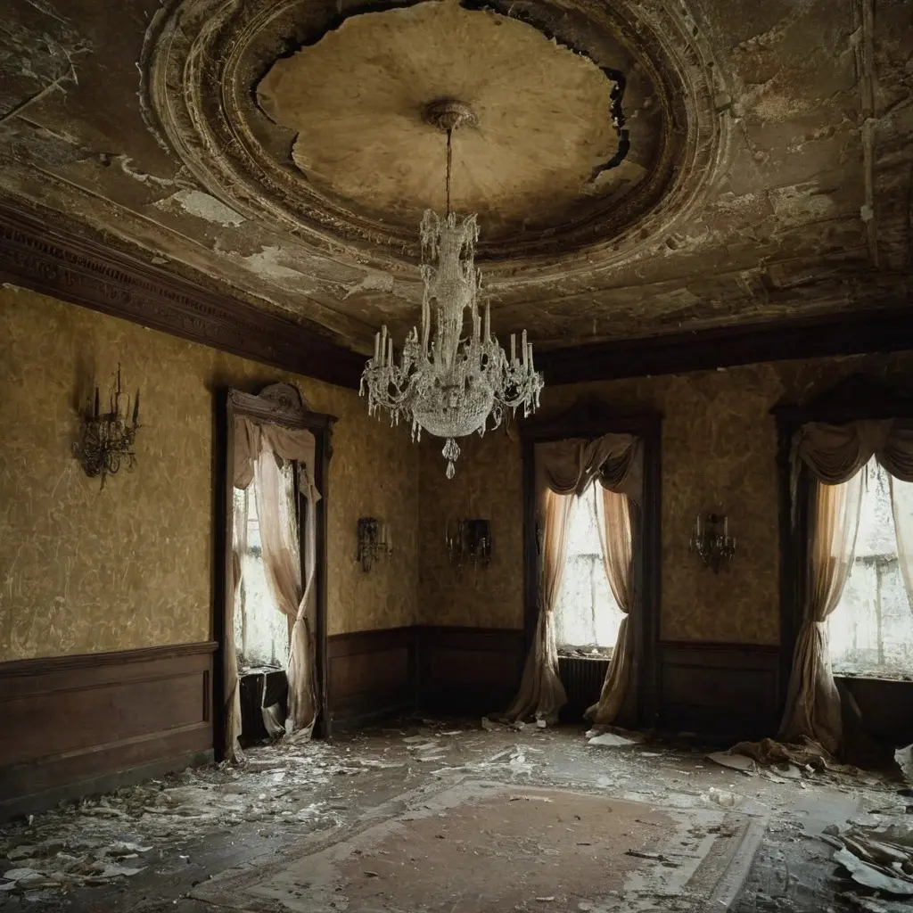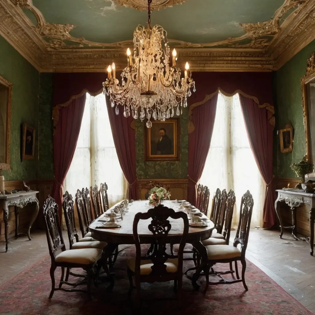 The dining hall of Evershade Manor might be the most unnerving of all. The long wooden table still stands, set for a dinner that never happened. Plates are cracked, silverware is rusted, and a once-sparkling chandelier dangles perilously from the ceiling.