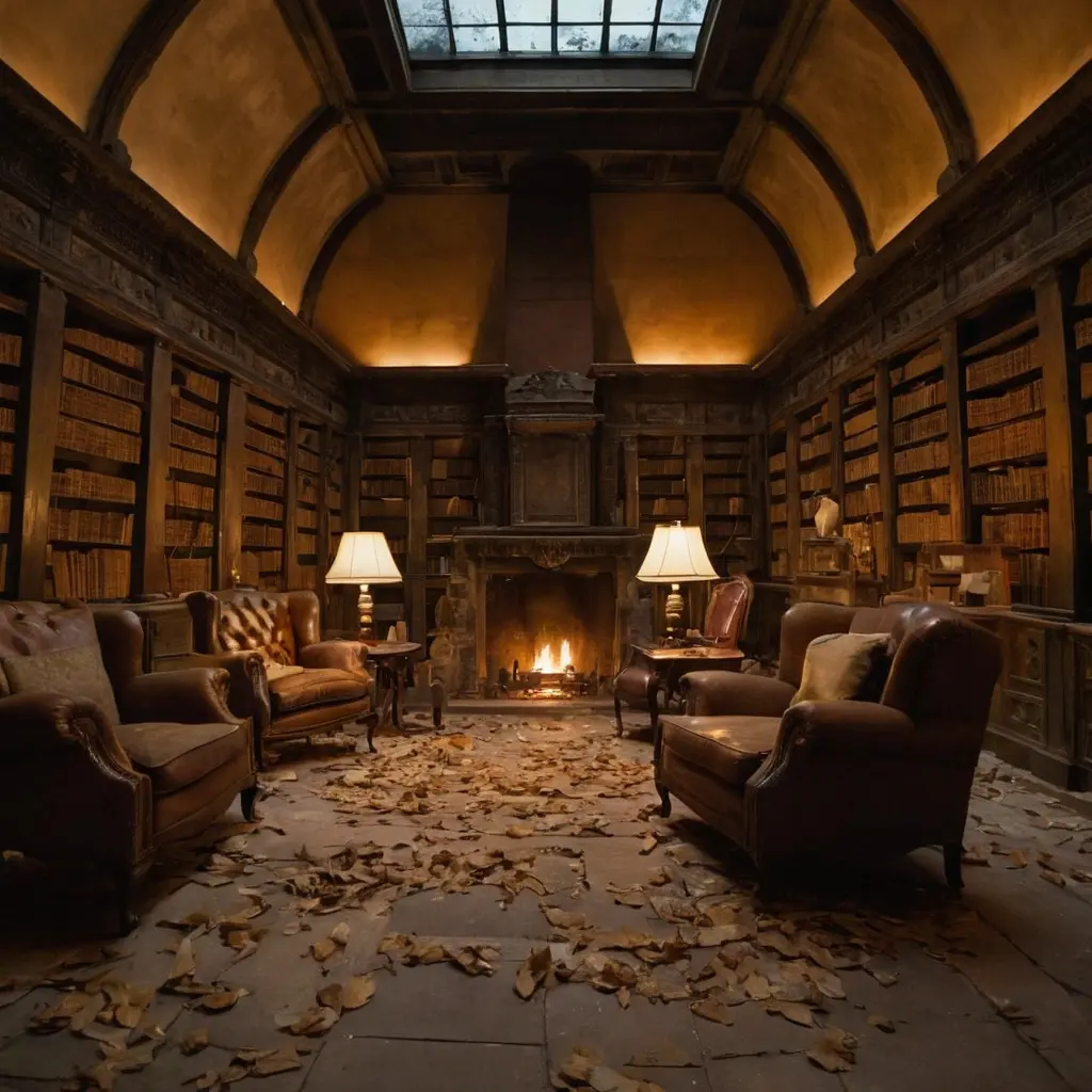 If the heart of the house still beats, it’s in the library. Hundreds of books line the walls — their spines faded, their words unread for decades. A faint scent of old parchment and smoke lingers in the air. The fireplace is cold, but ashes still rest beneath it, like someone once sat here reading deep into the night.