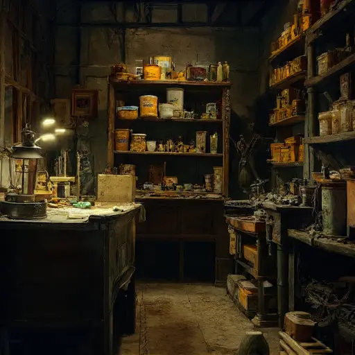 Unease threads itself through the upper rooms. In the Landing Closet, a broken reamer lies beside a notice from a Brussels manufacturer, edges blurred by moisture—perhaps a supply dispute, or a complaint of mismatched keys. A shallow bowl of steel pins has been overturned, leaving a delicate scatter across the shelf. In the Guest Cot Room, a travel coat lies half-folded, pockets filled only with a chipped file and a wrapped spare pick set—tools insufficient for a full departure.