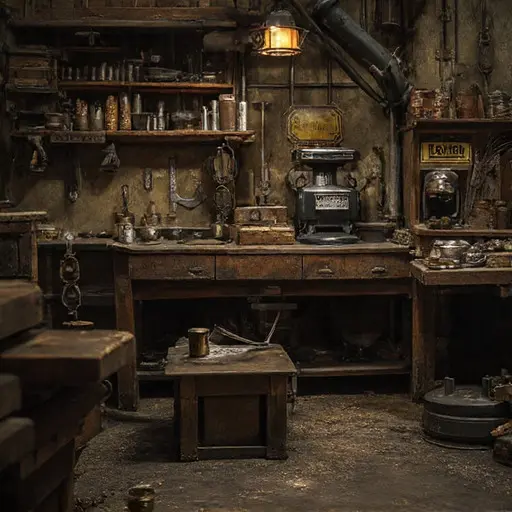 The Workroom settles into a muted stillness, touched by the faint tang of ground iron. On the locksmith bench, a half-shaped key rests beside a shallow brass ward whose groove stops abruptly. A swatch of leather once used for polishing hangs at the edge, hardened with time.