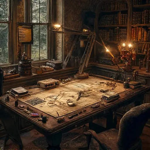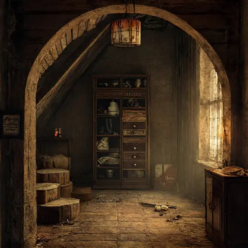 In the Atmospheric Observation Room, gears rest arranged by size, ink bottles sit grouped by viscosity, vellum charts lie under tarnished drafting weights, and primitive forecasting models—small brass frameworks designed to mimic wind behavior—remain aligned on shelves. Lyrine’s domestic steadiness survives: folded linens stacked by hue, herbal mixtures labeled neatly, and mending arranged in calm piles. Amelda’s faint presence lingers in a wooden toy vane, chalk-dusted number cards, and a folded drawing of a tiny house braced against swirling arrows.