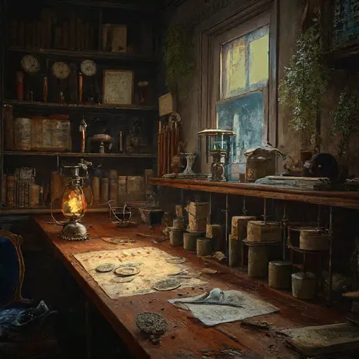 Thalen Crest Greymarrowe, a Victorian vibro-archivist devoted to recording the subtle tremors produced by machinery, foot travel, and architectural stress, lived here with his sister Luretta and her daughter, Eryn. Thalen’s notebooks brimmed with amplitude charts, rod-length calibrations, harmonic decay tests, and delicate etchings of vibration patterns gathered from various tools and floorboards. Soft-spoken and deeply attentive, he often stood perfectly still for minutes at a time, detecting shifts in the structure beneath his feet.