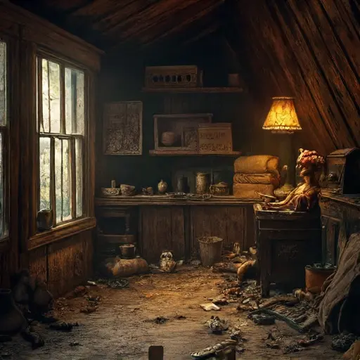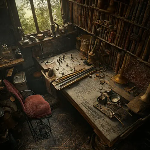 In the Acoustic Workshop Study, cylinders sit arranged by experiment, needle mounts lie in small velvet trays, and drafts of resonator horns cover an entire wall. Ilyra maintained the home with gentle precision—linens folded neatly, teas labeled for ailment or comfort, and mended garments set aside in tidy stacks. Naelle’s presence lingers in simple echoes: a paper bird folded lopsidedly, chalk numbers on a board, a wooden flute missing its mouthpiece.