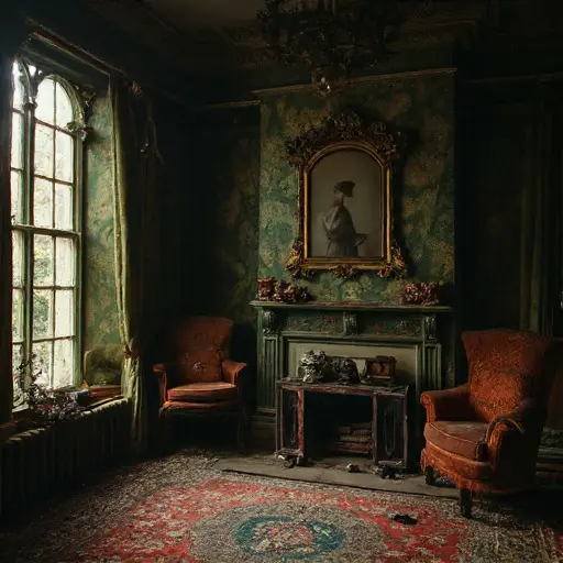 A faint metallic scent fills the room—old wax, drying oil, hardened lacquer. Greythollowe House feels frozen at the exact moment its resident stepped away, intending only to pause.