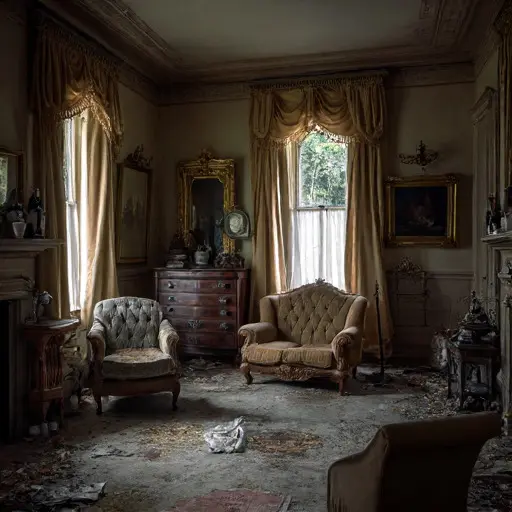 The house keeps its own counsel now, its rooms settled into abandonment, gears unwound and unanswered.