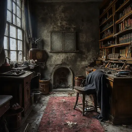 A faint sourness of machine oil lingers in the Study, though the lamps have not been trimmed in years. Somewhere beneath the drifts of paper lies a ledger, half-open as though its owner meant to return before the ink dried. The quiet suggests only halted routines, yet nothing here has been ransacked.