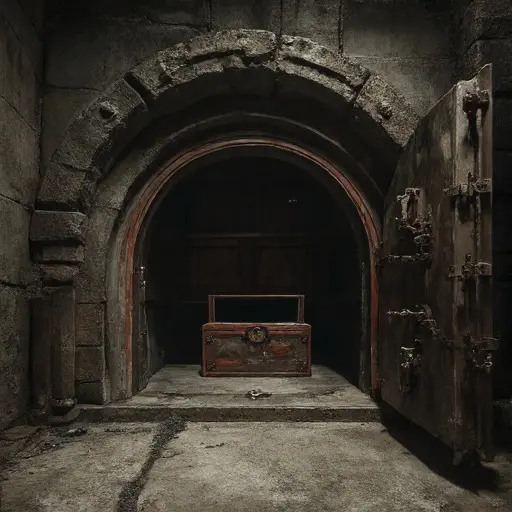 The ultimate puzzle of Cipher’s Ledge is the safe room, located deep within the basement and protected by two tons of steel and stone. The massive vault door stands open. The room inside is cold, dry, and clean—except for the dust. In the center, on a pedestal, sits a heavy, dark wooden box, intricately carved with geometric patterns.