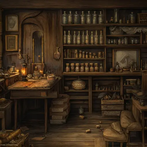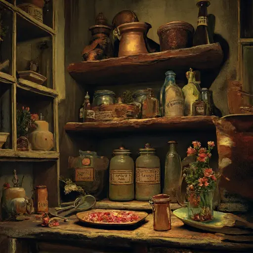 Returning to the Perfumer’s Atelier, attention gathers around the single vial of essence resting apart from its crate in the infusion cabinet. The label bears Émile’s delicate script, but the final flourish trails off, the ink thinning as though interrupted by a tremor or sudden reconsideration. The cabinet’s interior shelves show faint dust shadows where other vials once stood, recently moved or removed. A glass pipette lies at an odd angle across a folded cloth, its tip stained by a drop of tincture left to dry.