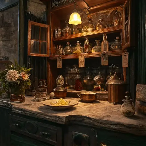 The Perfumer’s Atelier folds itself around a warm, resinous hush. At the center, the infusion cabinet stands half-open, its hinges stopping just short of a confident click. On the marble worktable nearby, a copper funnel leans toward a jar whose liquid meniscus wavers in a fragile tilt.