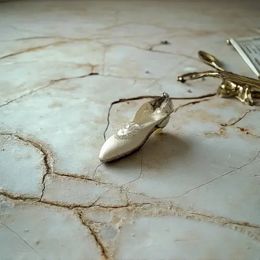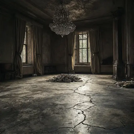 Resting on the deepest burn mark is a single, small, scorched white satin dance slipper—Elara’s, presumably. Tucked beneath the remnants of the marble baseboard is a final, simple object: a small, dark wooden baton, used for conducting music. Marble and Ember stands as a monument to abandoned spectacle, preserving the haunting, eerie silence of a massive stage where the final curtain fell not with applause, but with a searing, sudden self-destruction.