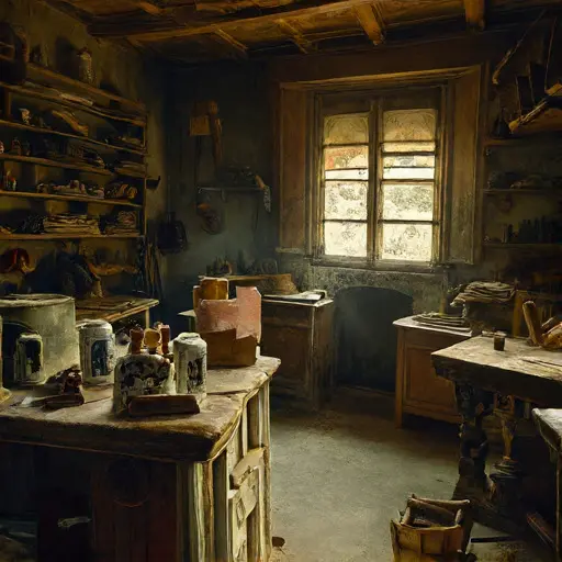 Copper plates lie untouched, ink dried partially in pots. A ledger beneath the main bench lists client commissions and etching steps but ends abruptly. Dust coats engraved surfaces, polishing cloths lie stiff, and stacks of prepared paper await impressions never taken. Burins rest across a leather pad, poised as though waiting for the next stroke, the room caught mid-gesture.