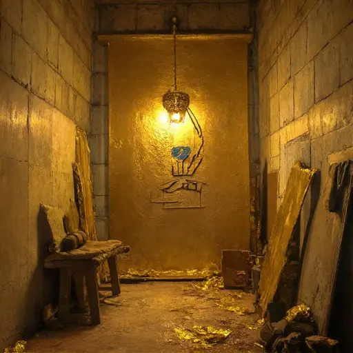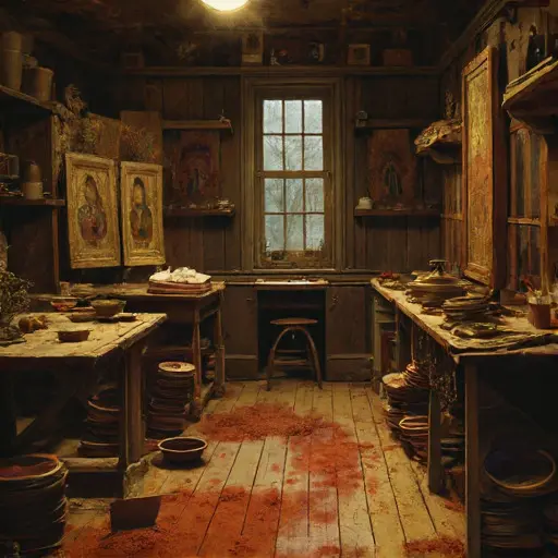 One quiet evening left subtle distress behind. A nearly finished icon leans on its easel, gold leaf clinging irregularly along the halo’s outer ring. A fine brush lies snapped at the ferrule. A bowl of tempera has congealed at its edges, pigment separating like thoughts pulled apart.