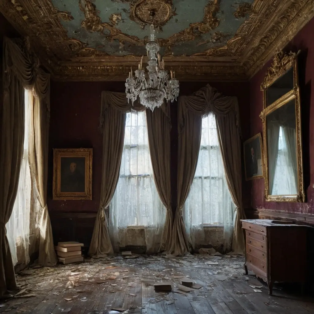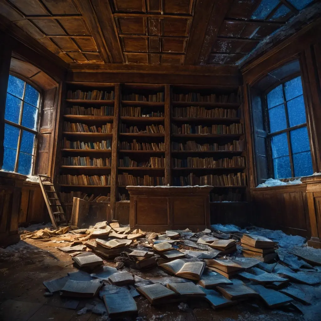 The library of Eldermoor Mansion is perhaps its most mesmerizing feature. Once home to thousands of rare books, it now stands in ruin, the air thick with age and dust. The scent of decay and old parchment lingers like perfume from another lifetime.