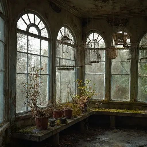 The first thing that strikes you about Ebonwood Glass is the light—or the deliberate lack of it. This peculiar abandoned Victorian house, built almost entirely with dark wood and an inordinate number of windows, now seems to actively resist illumination. The air inside the sprawling conservatory, its focus keyword prominently in view, is suffocatingly still, bearing the distinct, cloying scent of dried earth and aged cologne. Unlike the grand, imposing architecture of other estates, Ebonwood Glass feels intimate, yet deeply unwelcoming, as if designed to keep its inhabitants imprisoned in their own observations. Every pane of glass is a dusty screen through which the world outside is rendered colorless and distant. It is a place of profound, quiet suspense, where the smallest noise—a settling beam, the scrape of a shoe—is amplified into an event.