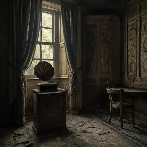 In a rarely visited corner of the second floor is the music room. This room holds the contradiction of Beatrice Thorne. While obsessed with silence, she possessed an expensive, state-of-the-art gramophone, still standing on its pedestal. The room is quiet, yet thick with the potential for sound. Scattered around the table are several blank record sleeves, labeled with elegant cursive: “The Sound of Thaw,” “April Morning’s Quiet,” and “The First Spring Rain.” These are not commercial recordings, but Beatrice’s own attempts to capture and preserve ambient sounds—her own auditory specimens.