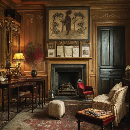 The hush in the drawing room clings to each object, as if breath once passed carefully over every quill here. Dust lies thin, almost deliberate, across open folios. The faint scent of resin ink persists in the upholstery, mixing with an older trace of citrus polish.