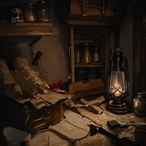 Behind the cabinet, a wrinkled note accuses Jens of forging an endorsement—no name given, only a seal impression smudged beyond clarity. A cracked inkwell rests on a linen napkin, its fracture wrapped hastily with twine. Pale marks on the rug trace restless pacing near the doorframe. The certificate on the music stand bears minor corrections layered too heavily, betraying an unsteady hand seldom seen in his earlier works.