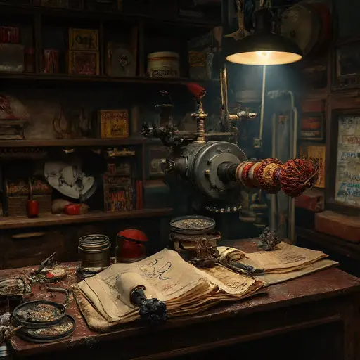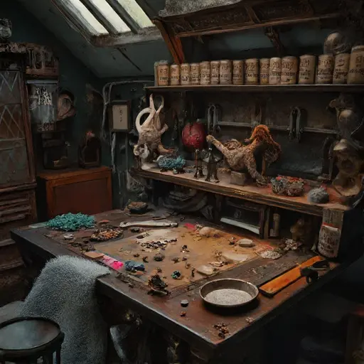 Hints of strain surface quietly. In the Upper Storage Cupboard, a cracked rouge tin lies beside a letter with a foreign jeweler’s crest—its seal dented, its message left unreadable by smudged edges. A recently bent prong from a gold brooch rests in a cotton-lined box, its damage at odds with his meticulous standards. The Guest Chamber reveals a travel coat draped over a chair, pockets padded with wrapped stones and receipts for overdue supplies. Perhaps debts crept in, or a commission demanded brilliance he doubted he could match.