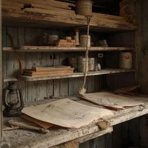 On the table, a partially completed mechanical lock rests beside the blueprint. Pencil notes are scattered, lines crossed out and retraced. Smudges of graphite suggest repeated rethinking. Some sketches are rolled and tied, others half pinned to the wall. Tools lie haphazardly as though dropped mid-motion. Dust patterns reveal hurried movement; the room suggests a sudden halt in work, rather than gradual decline.