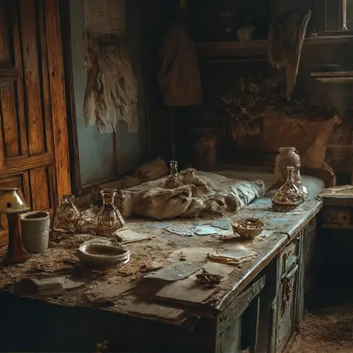 The house remains abandoned, its reagents, apparatus, and formulas suspended in quiet anticipation, preserving the halted rhythm of chemical inquiry that will never resume, a silent testament to careful labor left unfinished.