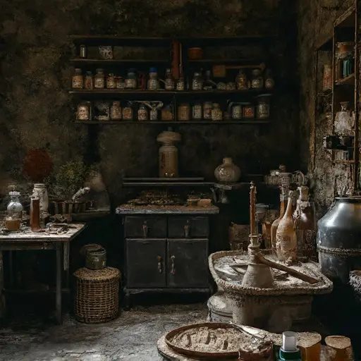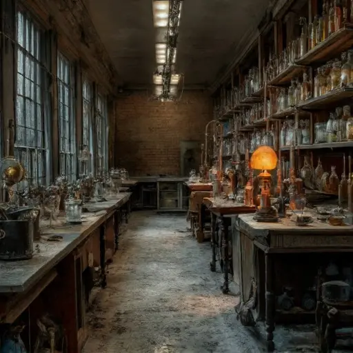A quiet, acrid stillness fills the Laboratory, where a penciled formula notation in a notebook stops mid-reaction, leaving mixtures and chemical charts forever incomplete.