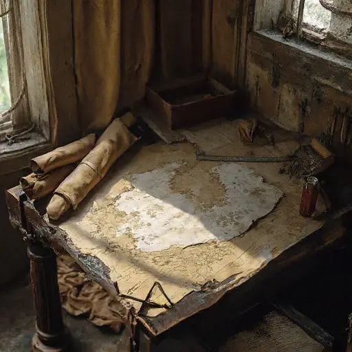 Tables hold half-inked maps and scattered instruments. Compasses, rulers, quills, and ink pots lie stiff with dust. Shelves of rolled parchments rest nearby. Edmund’s ledger, weighed down by a brass ruler, details geographic coordinates, survey notes, and scale calculations. Dust settling over implements emphasizes abrupt cessation of repeated, precise gestures, silence accentuated by half-completed maps and displaced tools.