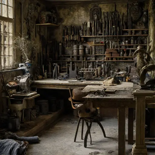 The absence of movement leaves a tense stillness, each object preserving the memory of artistry abruptly interrupted.