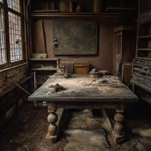 The Engraving Studio resonates with suspended precision. Here, the draft guided every incision: lines measured, surfaces polished, impressions tested. Plates rest mid-work, ink wells half-filled, and prints lie stacked but unfinished.