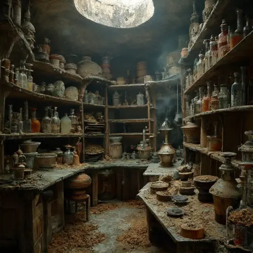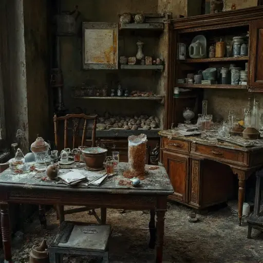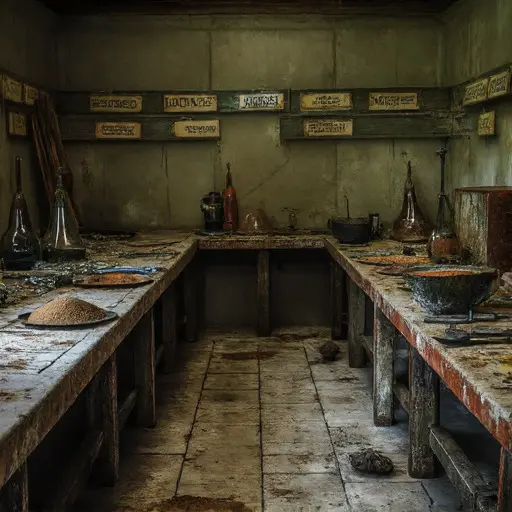 The house remains abandoned, glassware, powders, and alchemical tools awaiting hands that will not return, the quiet heavy with unfinished experimentation and lost mastery.