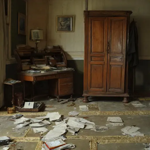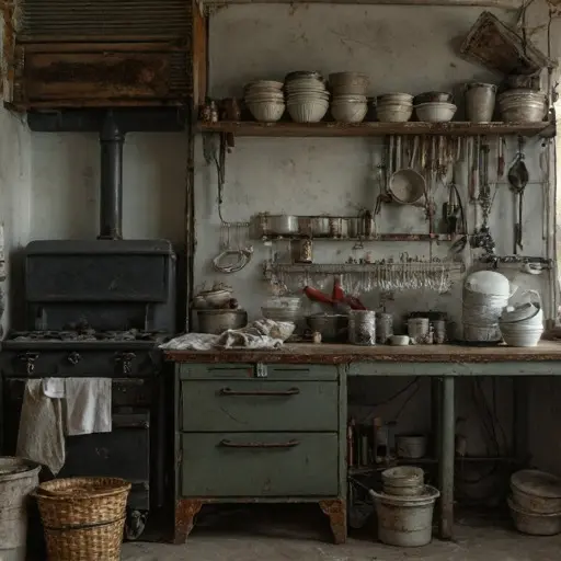 The house remains abandoned, its dim surfaces preserving the quiet uncertainty of processes left undone quietly steadily irrevocably.