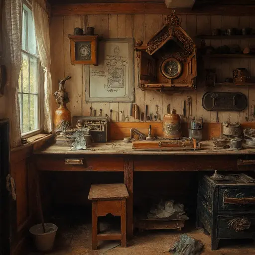 A tentative hush inhabits the Workshop, as though each tool waited at some invisible borderline between precision and collapse. The tick that once shaped the hours is nowhere, leaving only faint scent of oil and the stilled weight of metal. No sign reveals why the craftsman ceased.