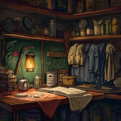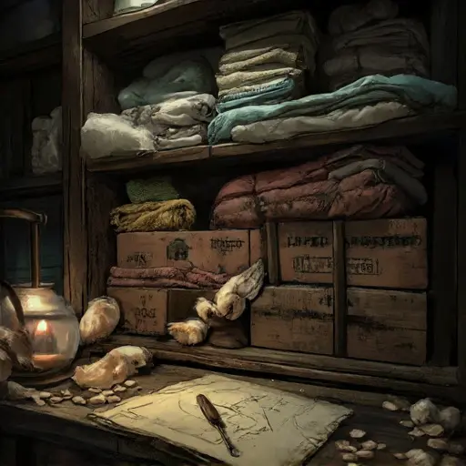 Returning to the washroom, one final clue rests on the low table: a single, perfectly aligned sleeve pinned to a front panel whose mate lies miscut—still waiting for the correction Béla never dared to attempt.