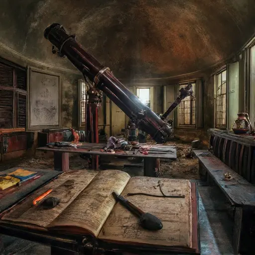 Telescopes and brass instruments rest unused. Star maps are pinned to boards, some corners curling from humidity. A ledger beneath scattered sketches tracks transit times, telescope azimuths, and alignment calculations, stopping mid-entry. One chart shows a lunar observation interrupted mid-notation. Dust and fingerprints mark the last interactions with tools, evidence of work paused abruptly but carefully, as if Moreau intended to return imminently.