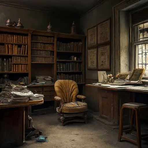 The house remains abandoned, ledgers untouched, scales idle, ink dried, the accounting room holding the precise absence of a life governed by calculation and ended by suspicion. Its order persists, yet the story remains unresolved, a disciplined routine suspended indefinitely, leaving the room haunted by the quiet weight of halted labor and unproven fault.