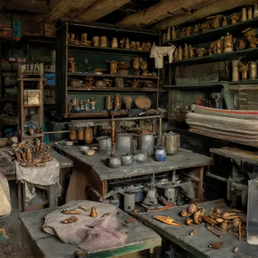The oak table is cluttered with measuring tapes, scissors, and ink pots. Folded fabric swatches lean against drawers, edges frayed with age. Partially completed patterns rest beneath small weights. Each object reflects careful repetition, steady hands, and a dedication to meticulous craft. Even dust has settled in gentle lines along threads and spools, echoing the halted rhythm of the artisan’s hand.