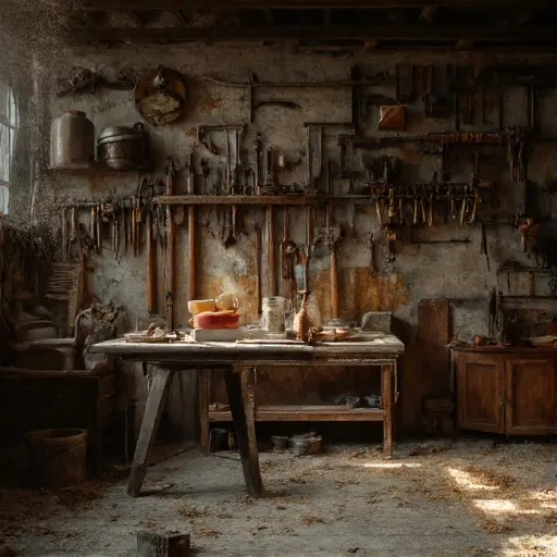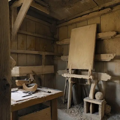 Every object suggests labor paused, the sudden absence palpable. Silence dominates, punctuated only by imagined clatter of chisels and sanding blocks long still.
